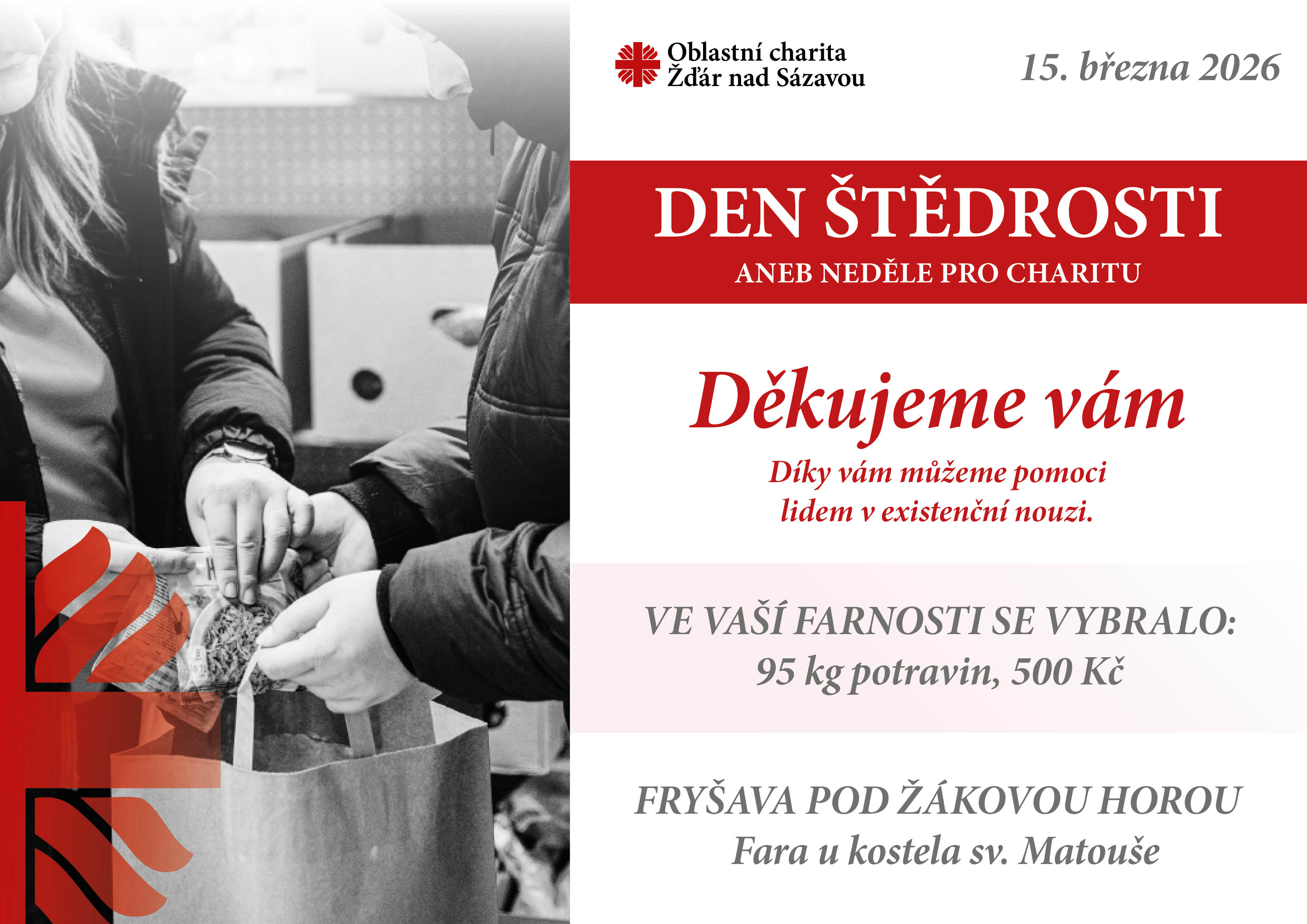 Tento den je věnován podpoře Charitní záchranné sítě, která pomáhá lidem v nouzi a těžkých životních situacích – těm, kteří nemají kam se obrátit a potřebují naši pomoc.