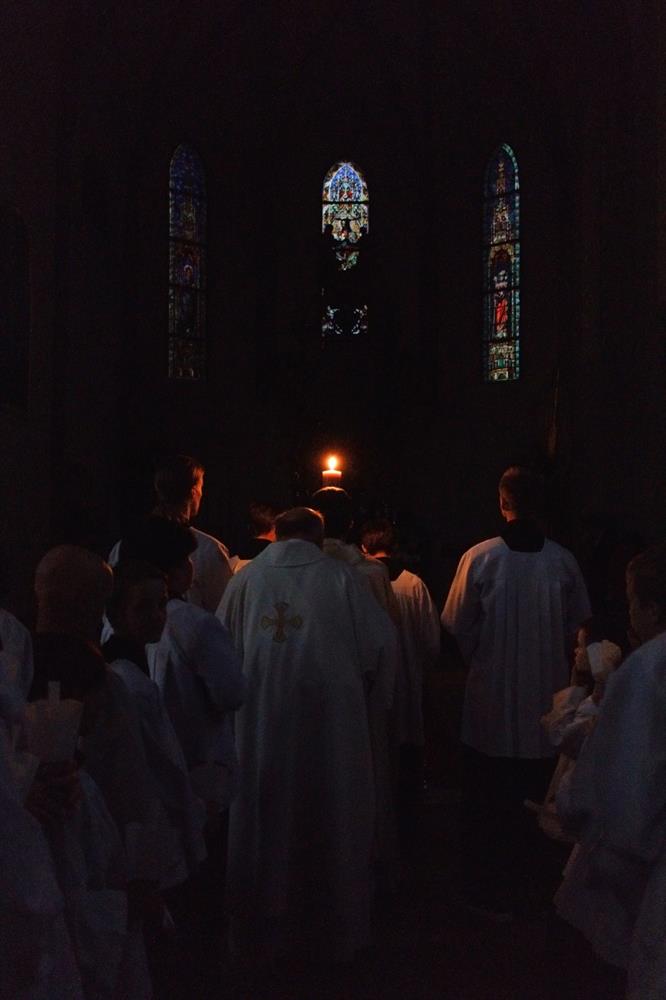 Paškál je přinášen do ztemnělého kostela "Světlo Kristovo!"